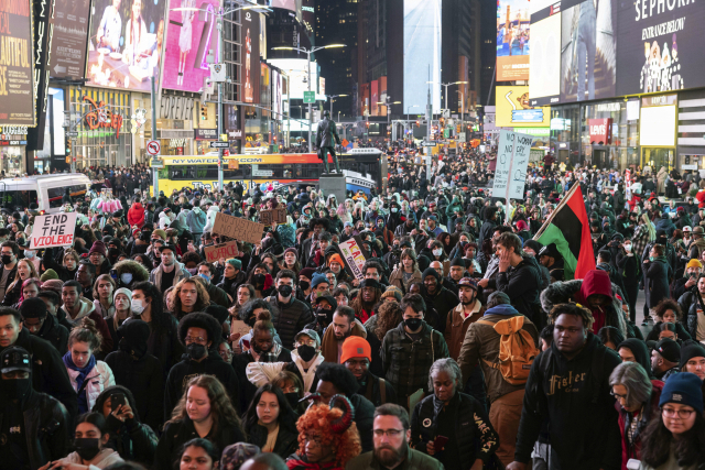 경찰의 폭력으로 흑인이 또 숨지는 사건이 발생해 미국 대도시에서 시위가 발생했다. 28일(현지시간) 미국 뉴욕 타임스스퀘어에서 시위대들이 흑인 청년 타이어 니컬스(29)를 숨지게 한 경찰의 과잉진압에 항의하고 있다. AP연합뉴스연합뉴스