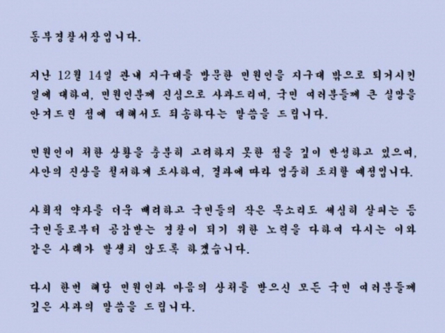 한겨울밤 마지막 기차를 놓친 70대 할머니가 몸을 녹이려 부산의 한 경찰서 지구대를 찾았다가 쫓겨난 사건이 발생했다. 파장이 커지자 해당 경찰서장은 공식 사과문을 내고 고개를 숙였다.