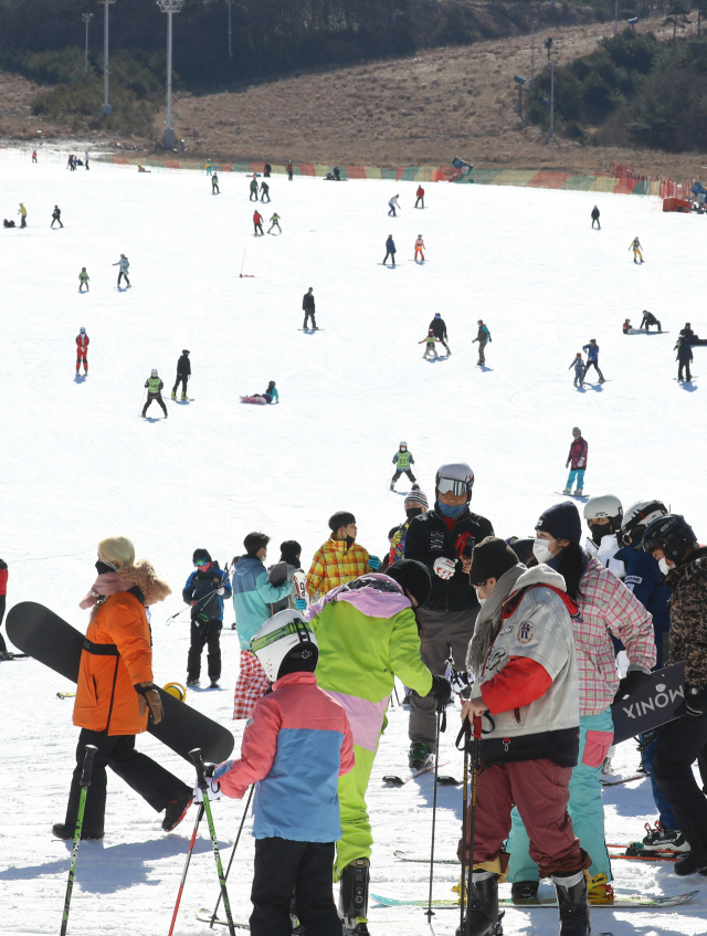 29일 경남 양산 에덴밸리 스키장에서 시민들이 스키와 스노보드를 즐기고 있다. 기상청은 한파가 누그러져 점차 기온이 올라갈 것이라고 예보했다.