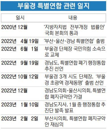 부산시가 오는 3월까지 경남도와의 행정통합을 본격적으로 추진하기 위한 ‘행정통합추진단’을 구성하기로 했다. 하지만 출범을 눈앞에 뒀던 부울경 특별연합은 폐기 수순을 밟으면서 이보다 더 결속력 있는 형태인 행정통합을 추진하는 것에 대해 비판이 제기된다. 부산시장과 경남도지사가 부울경 특별연합 폐지에 대한 정치적 비난을 피하기 위해 실현 가능성이 떨어지는 행정통합을 들고 나온 것 아니냐는 지적과 함께 행정력과 예산 낭비라는 비판도 나온다.