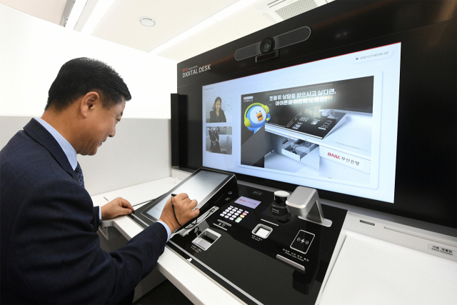 안감찬 부산은행장이 ‘디지털데스크’에서 직원과 화상 상담을 하는 모습. BNK부산은행 제공