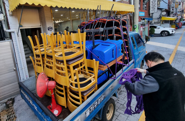 경기 한파의 영향으로 문을 닫는 자영업자들이 늘어가고 있다. 사진은 부산 동구 한 식당이 폐업을 하고 집기를 트럭에 싣고 있는 장면. 김경현 기자 view@