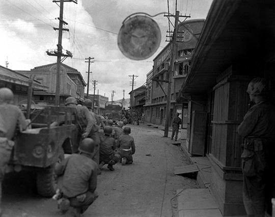 1950년 7월 20일 미군 24사단 병사들이 대전시내에서 인민군 저격병의 공격에 응사하며 시가전을 벌이고 있다. 그해 7월 19일부터 이틀간 치열하게 전개된 대전전투는 낙동강 방어선 구축을 위한 소중한 시간을 벌어 줬다. 미국 국립문서기록관리청(NARA) 제공