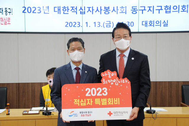 부산 동구청(구청장 김진홍·오른쪽)은 최근 대한적십자사 부산지사(회장 서정의)에 2023년 적십자 특별회비를 전달했다.