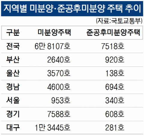 악성 물량으로 불리는 준공후 미분양 주택은 전국에 7518호로, 한달 전에 비해 408호가 늘어났다. 부산은 920호인데 7호가 감소했다. 그러나 부산의 준공후 미분양은 전국에서 전남(941호)에 이어 두번째로 많다.