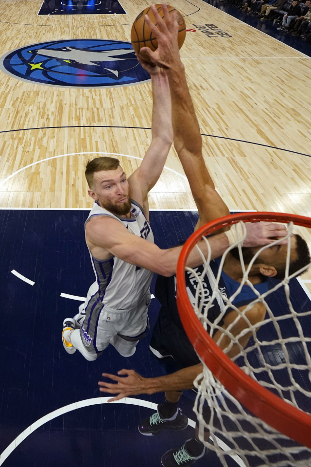 새크라멘토 킹스의 도만타스 사보니스(왼쪽)가 30일(현지시간) 미네소타주 미니애폴리스 타깃센터에서 열린 2022-2023 미국프로농구(NBA) 미네소타 팀버울브스와의 경기에서 팀버울브스 루디 고버트의 얼굴을 오른손으로 누른 채 슛을 시도하고 있다. 새크라멘토가 118-111로 승리했다. AP연합뉴스