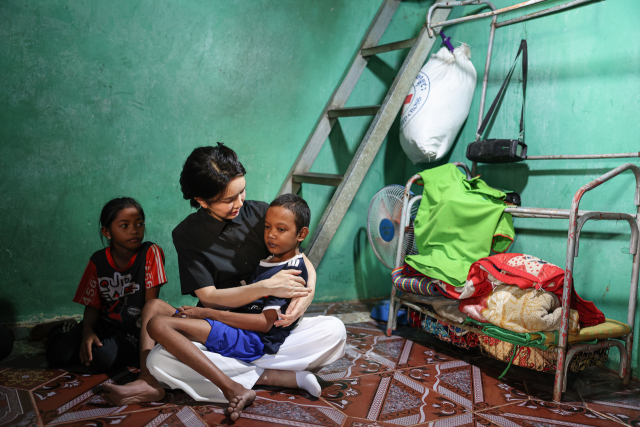 윤석열 대통령 부인 김건희 여사가 지난해 11월 12일(현지시간) 캄보디아 프놈펜의 한 선천성 심장질환을 앓고 있는 환아의 집을 찾아 건강 상태를 살피고 있다. 김 여사는 전날인 11일 헤브론 의료원을 방문했을 때 심장병 수술을 받은 아동들을 만나는 자리에 건강 상태가 좋지 않아 참석하지 못했던 이 환아의 집을 이날 방문했다. 연합뉴스