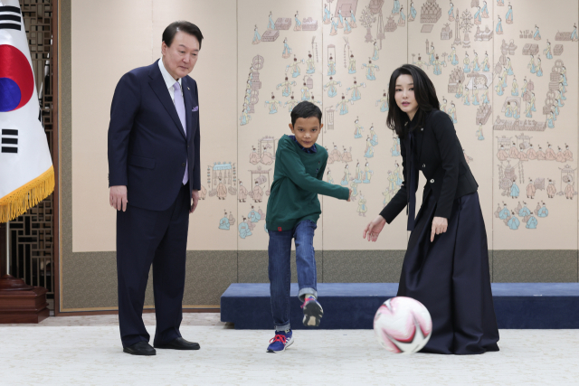 윤석열 대통령과 김건희 여사가 31일 서울 용산 대통령실 청사에서 심장질환 수술을 받고 회복 중인 캄보디아 아동 '로타'와 축구를 하고 있다. 연합뉴스