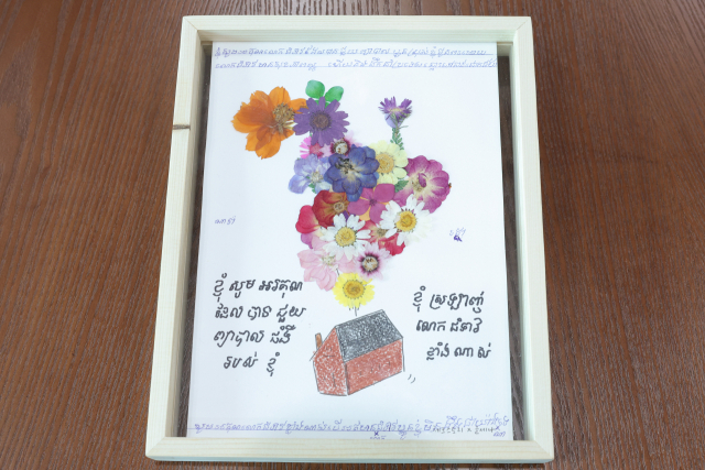 '캄보디아 심장병 환아' 로타 군이 31일 서울 용산 대통령실 청사에서 윤석열 대통령 내외에게 전달한 감사인사가 담긴 꽃으로 장식한 엽서. 연합뉴스