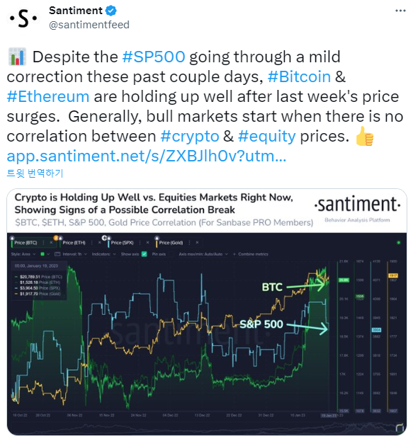 실제로 가상자산 분석 전문 업체인 샌티멘트(Santiment)는 지난달 20일 공식 트위터를 통해 “S&P500의 약세에도 불구하고 비트코인과 이더리움은 잘 버티고 있다. 일반적으로 강세장은 가상자산과 주식 간의 상관관계가 없을 때 일어난다”고 설명했다. 코인 메트릭스의 리서치 리더 네이트 마드레이(Nate Maddrey) 또한 지난해 10월 디크립트를 통해 “역사적으로 비트코인은 주식 시장과 높은 상관관계가 없었기 때문에 추세가 낮은 상관관계로 되돌아가기 시작할 가능성은 항상 있다”고 밝힌 바 있다.