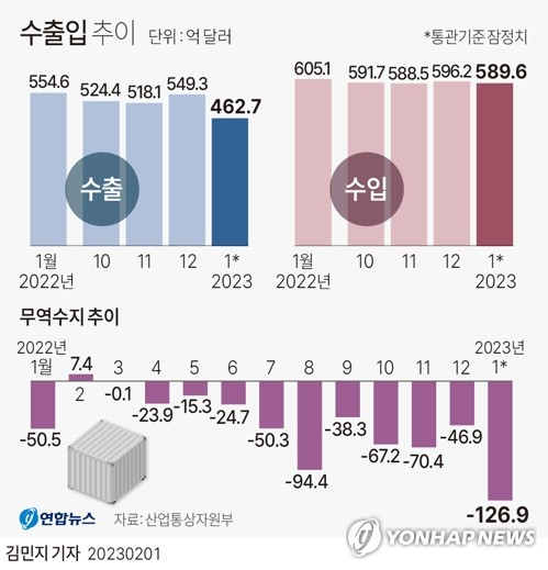 이에 따라 1월 무역수지는 마이너스 126억 9000만 달러(15조 6000억 원)로 월간 역대 최대 규모 적자를 기록했다. 1956년 무역 통계 집계가 시작된 이래 무역수지 적자액이 100억 달러를 넘은 것은 지난달이 처음이다. 월간 기준으로 종전 무역적자 최대치인 작년 8월(94억 3000만 달러) 기록을 훌쩍 뛰어넘은 수치다. 무역수지는 11개월째 적자 행진이 이어졌다.