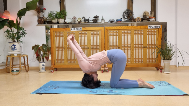 무릎을 꿇고 앉아 엉덩이를 들어 올려/정수리 바닥 대고 깍지 낀 양팔일랑/머리 쪽 최대한 당겨 뭉친 근육 푸소서