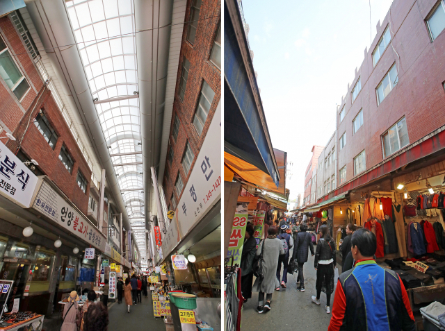 부평깡통시장 6차 아케이드 천장 일부 구간이 빈 채 설치된다. 8m 높이의 아케이드가 설치된 부평깡통시장(왼쪽)과 6차 아케이드가 설치될 부평깡통시장 골목(오른쪽). 부산일보 DB