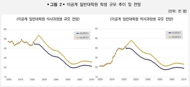보고서는 통계청의 장래인구추계를 바탕으로 최근 3년간 이공계 대학원생 비중이 미래에도 이어진다는 가정하에 이공계 일반대학원 석사과정생은 2021년 4만 6542명에서 2만 2000여 명으로, 박사과정생은 같은 기간 4만 1100명에서 2만여 명으로 줄어들 것으로 예측했다.