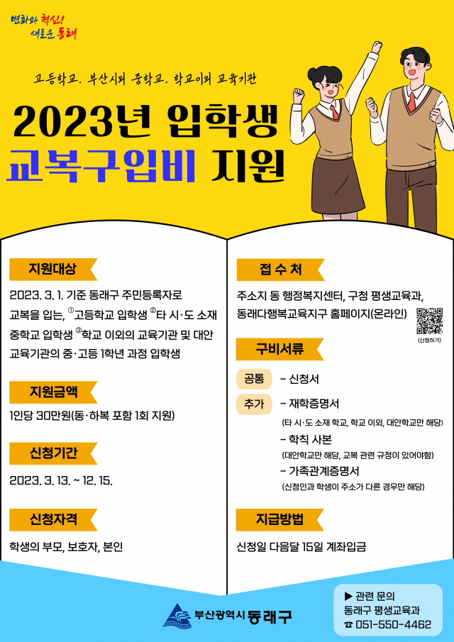 동래구, 2023학년도 고등학교 입학생 ‘교복 구입비 지원’
