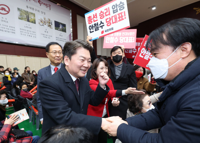 국민의힘 안철수 당대표 후보가 5일 오후 서울 동대문구청 대강당에서 열린 국민의힘 동대문구 갑을 합동 당원대회에서 참석자들과 인사를 나누며 파이팅을 외치고 있다. 연합뉴스