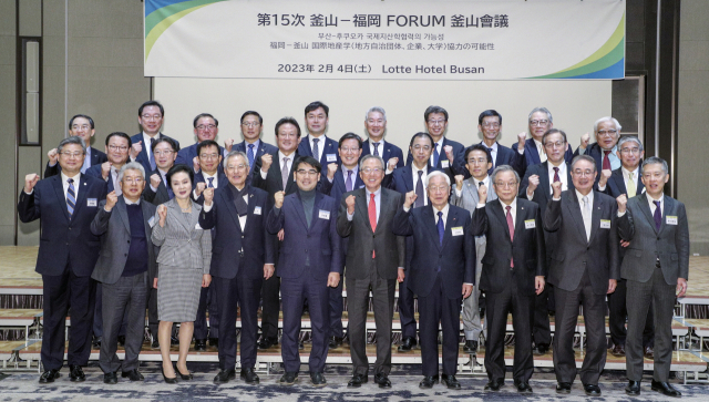 제15차 부산-후쿠오카 포럼 부산회의가 지난 4일 부산 롯데호텔에서 열렸다. 참석 내빈들이 포럼의 발전을 기원하며 기념 촬영을 하고 있다. 김종진 기자 kjj1761@