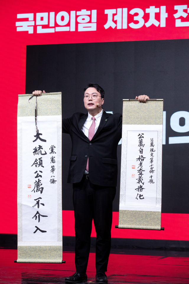 ‘웃통’ 벗은 사진에 비책 족자 등장한 국힘 정견발표장
