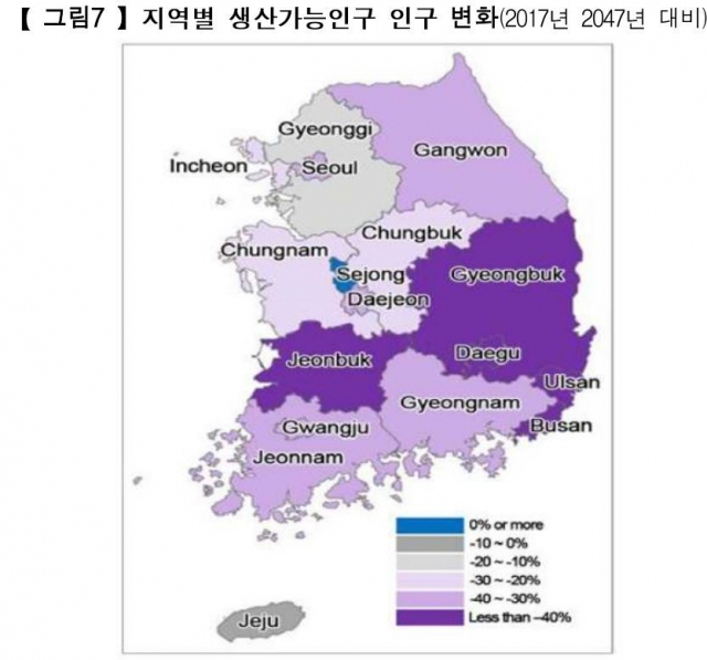 우선, 2047년까지 한국의 생산가능인구는 2017년 대비해서 16개 시·도(세종 제외)에서 감소할 전망이다.