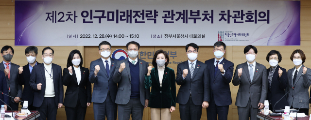 나경원 전 저출산고령사회위원회 부위원장이 지난해 12월 28일 정부서울청사에서 열린 제2차 인구미래전략 관계부처 차관회의에서 참석자들과 기념촬영을 하고 있다. 연합뉴스