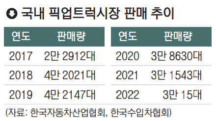 픽업트럭은 북미 시장에선 주류 차종으로 꼽히지만 국내에선 그동안 주차 불편과 승차감 저하 등을 이유로 기피해왔다. 하지만 캠핑이나 차박 등 야외에서 즐기는 레저 활동이 활발해지고, 농어촌 등에서 활용성이 높아지면서 픽업트럭 수요도 확대 추세다.