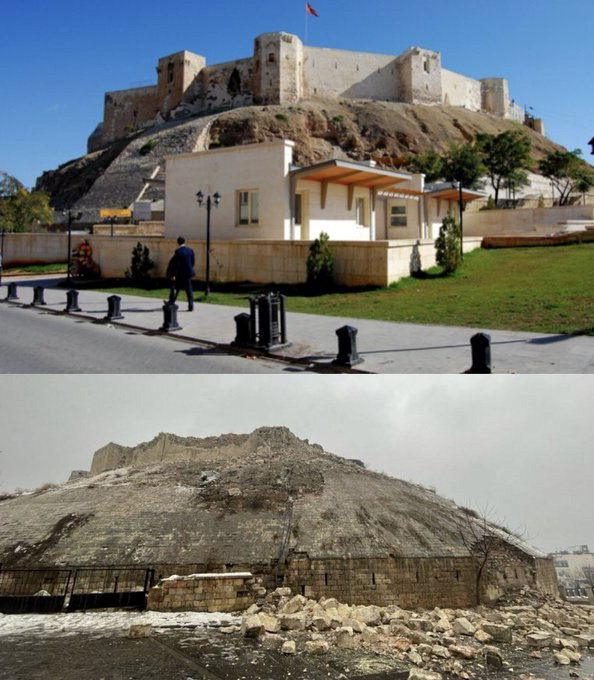 가지안테프성 원래 모습(위)과 지진으로 훼손 된 사진. 트위터 캡처