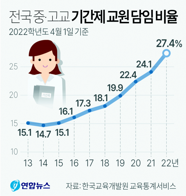 7일 한국교육개발원 교육통계에 따르면 2022학년도(4월 1일 기준) 전국 중·고교 담임 11만 295명 중 기간제 교원이 27.4%(3만 173명)에 이른다.