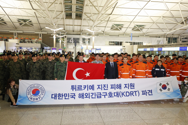 외교부 등에 따르면 외교부, 소방청, 한국국제협력단(KOICA·코이카), 군 인력 등 총 118명으로 구성된 긴급구호대가 인천공항 1터미널에서 이날 밤 10시 출정식을 했다. 출정식에는 외교부 박용민 다자외교조정관, 살리 무랏 타메르 주한 튀르키예 대사 등이 참석했다. 이들은 이후 인천공항에서 우리 군의 KC-330 다목적 수송기편을 이용해 튀르키예 동남부 아다나 공군기지로 향했다. 긴급구호대는 튀르키예 측 요청에 따라 탐색 구조팀 중심으로 꾸려졌다. 소방청에서 파견된 국제구조대에는 지휘관 1명 외에 구조팀 36명, 탐색팀 8명, 운영팀 10명, 물류팀 6명으로 구성됐고, 구조견도 4마리도 포함됐다. 여기에 육군 특수전사령부(특전사)를 비롯한 군 인력 50명이 긴급구호대에 추가 합류했다.