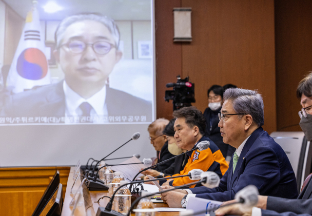 박진 외교부 장관이 7일 오후 서울 종로구 외교부 내 상황실에서 열린 튀르키예 지진피해 민관합동 해외지원협의회에 참석해 발언하고 있다. 연합뉴스