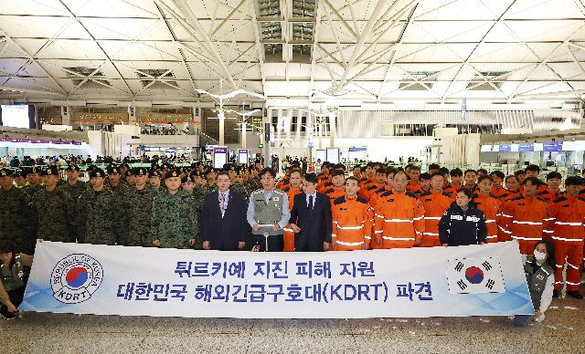 튀르키예 지진 실종자 수색 등을 위한 대한민국 긴급구호대(KDRT) 대원이 7일 오후 인천국제공항 제1여객터미널에서 출정식을 하고 있다. 정부는 외교부, 소방청, 코이카(한국국제협력단), 국방부 등으로 구성된 110여 명의 긴급구호대를 튀르키예로 파견한다. 연합뉴스