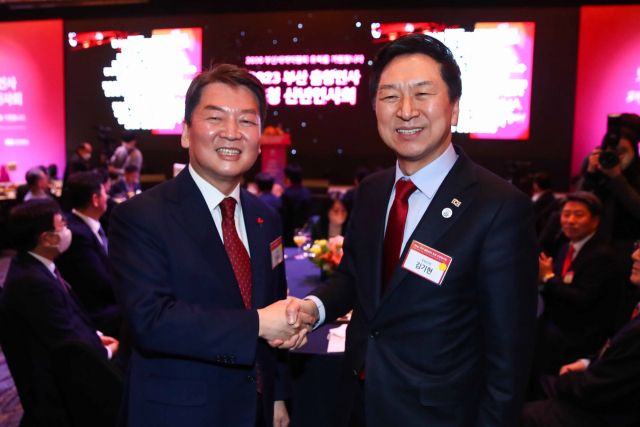 국민의힘 당권주자인 김기현 의원(오른쪽)과 안철수 의원(왼쪽)이 1월 16일 서울 중구 롯데호텔에서 열린 '2023 부산 출향인사 신년인사회'에 참석해 인사하고 있다. 김종호 기자 kimjh@