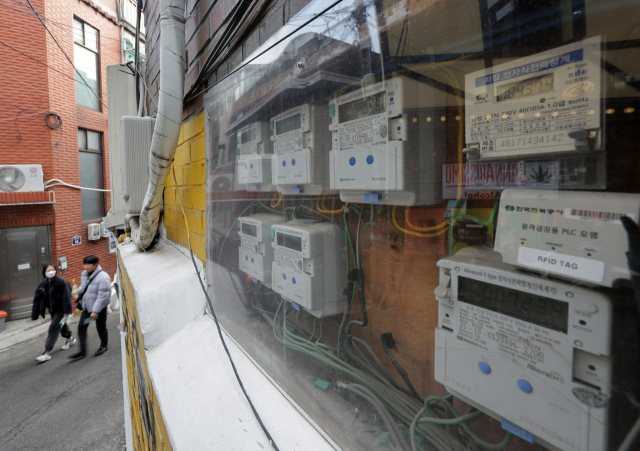 지역난방을 하는 취약계층(기초생활수급자·차상위계층) 8만 4000가구에 대해서도 도시가스를 이용하는 취약계층(168만 가구)과 마찬가지로 올겨울 난방비가 최대 59만 2000원 지원된다. 서울 시내 한 건물에 전기 계량기가 나란히 설치돼 있는 모습. 연합뉴스