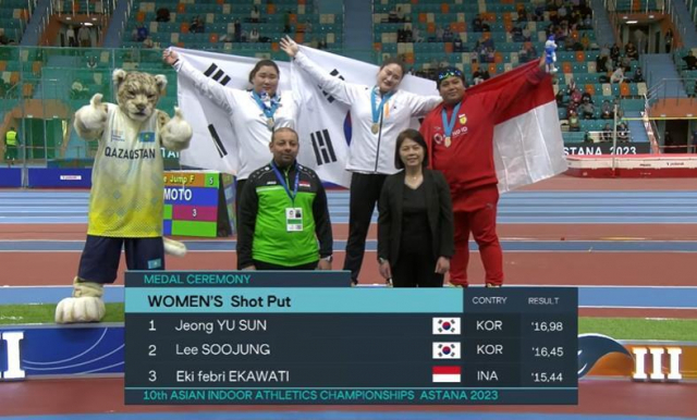 국내 여자 포환던지기 최강자인 정유선(26·안산시청)이 아시아 실내육상선수권대회에서 금메달을 따냈다. 이수정(30·서귀포시청)은 2위에 오르며 한국 대표팀 선수들이 시상대를 지배했다.