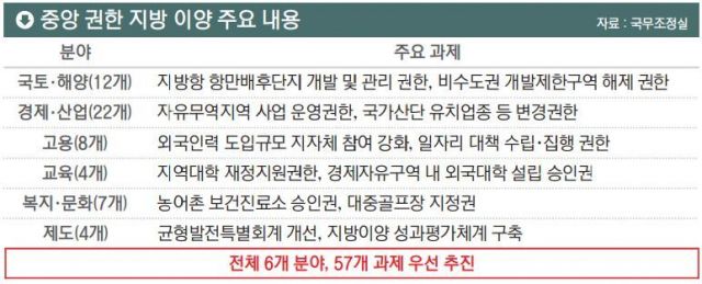 윤석열 정부는 국정과제인 ‘지방시대’를 앞당기기 위해 중앙 정부가 가진 6개 분야 57개 주요 권한을 지방으로 우선 이양하기로 결정했다.