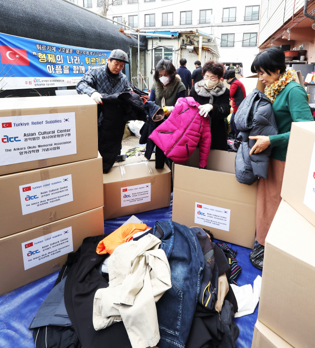 13일 경기도 수원시 장안구 파장동 한 창고에서 아시아문화연구원과 앙카라학원 기념사업회 관계자들이 지진으로 어려움을 겪고 있는 튀르키예로 보낼 구호품을 포장하고 있다. 연합뉴스