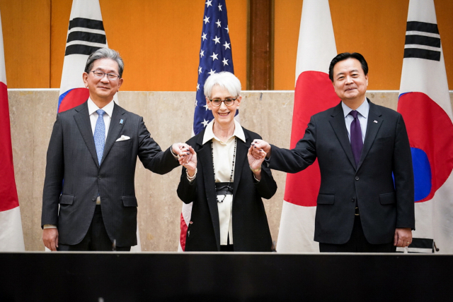 조현동 외교부 제1차관(오른쪽), 웬디 셔먼 미국 국무부 부장관, 모리 다케오 일본 외무성 사무차관이 지난 13일(현지시간) 워싱턴 DC에서 기념촬영을 하고 있다. 연합뉴스