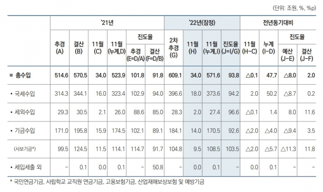 작년 11월 누계 기준(2022년 1~11월) 총수입은 571조 6000억 원, 총지출은 622조 5000억 원으로 각각 집계됐다. 지출 규모가 수입 규모를 웃돌면서 통합재정수지(총수입-총지출)는 50조 8000억 원 적자를 기록했다. 통합재정수지에서 국민연금 등 4대 보장성 기금을 차감해 정부의 실질적인 재정 상태를 보여주는 관리재정수지는 98조 원 적자였다.
