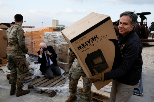 토니 블링컨 미국 국무장관이 19일(현지시간) 튀르키예 아다나 인근 인질릭 공군기지에서 미군 병사들의 구호물자 운반을 돕고 있다. 로이터연합뉴스