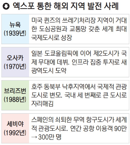 엑스포 개최를 통해 한 나라의 수도가 아닌 제2, 제3의 도시가 국제도시로 성장한 사례도 적지 않다. 미국 뉴욕은 1939년 엑스포 개최를 계기로 퀸즈 지역의 쓰레기처리장이 있던 곳에 거대한 도심 공원과 교통망을 갖춰 세계 최대 국제도시로 발돋움했다. 호주 브리즈번도 1988년 엑스포 개최 후 동북부의 낙후지역에서 국제적 관광도시로 자리매김했다.