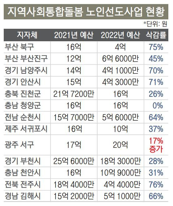 20일 〈부산일보〉가 지역사회통합돌봄 노인 선도사업에 참여한 전국 13개 지자체를 대상으로 통합돌봄 현황을 확인한 결과, 광주 서구와 충남 청양군을 제외한 11개 지자체에서 통합돌봄 사업이 대폭 축소됐다. 예산이 줄면서 부산 북구, 부산진구, 전북 전주시 등에서 진행하던 7개 사업이 중단됐고, 그 외 지자체에서도 진행 사업 일부를 폐지했다.