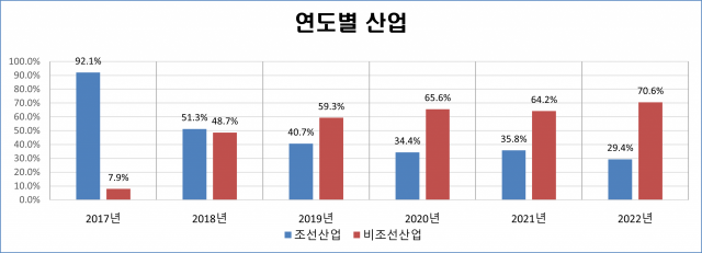 2017년 92.1%로 압도적이었던 조선 산업 관련 상담은 이듬해 54.3%로 줄었고, 2018년 40.6%로 역전된 이후 줄곧 감소세다.