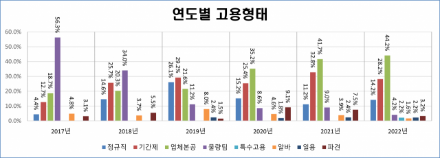 고용 형태의 변화도 뚜렷하다. 조선업 구조조정이 한창이던 2017년에는 물량팀(56.3%), 업체본공(18.7%), 기간제(12.7%) 노동자가 주된 내담자였다. 2018년 역시 물량팀과 기간제, 업체본공 노동자 비중이 여전히 높았지만, 정규직 상담도 14.6%로 증가했다. 2019~2021년에는 물량팀보다 기간제나 업체본공 상담이 늘었다. 작년엔 업체본공(44.2%), 기간제(28.2%), 정규직(14.2%), 물량팀(4.2%), 파견용역(3.2%), 특수고용‧일용직(2.2%), 아르바이트(1.6%) 순으로 나타났다.