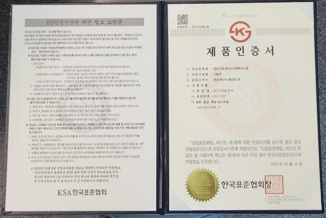 양산시가 최근 한국표준협회로부터 받은 용융슬래그에 대한 KS 인증서. 양산시 제공