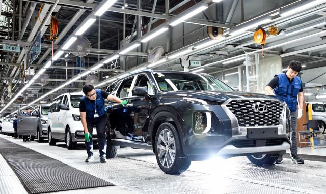 현대자동차와 에쓰오일 등 높은 연봉과 파격 복지 등으로 구직자들 사이에서 인기를 끄는 기업들이 채용에 나서 취업시장이 들썩인다. 현대자동차 울산공장 생산라인 모습. 부산일보DB