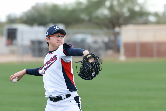 22일(현지시간) 미국 애리조나주 투손 키노스포츠 콤플렉스 보조 구장에서 야구 대표팀 투수 박세웅이 캐치볼을 하고 있다. 연합뉴스