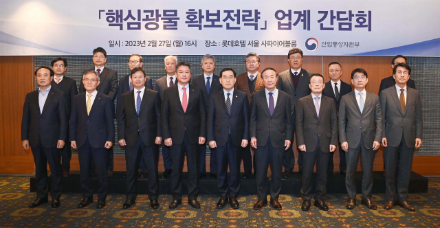 이창양 산업통상자원부 장관(앞줄 중앙)이 27일 오후 서울 중구 롯데호텔에서 열린 ‘핵심광물 확보전략 업계 간담회’에 참석해 기념 촬영하고 있다. 산업부 제공