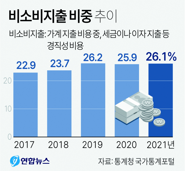 전체 가계지출(359만 1000원) 대비 비소비지출 비중은 26.5%로 전년(26.1%)보다 0.4%포인트(P) 상승했다. 이는 1인 가구 포함 조사가 시작된 2006년 이래 연간 기준으로 가장 높은 수치다. 비소비지출 비중은 2017년까지만 해도 22.9%에 그쳤으나 2018년 23.7%, 2019년 26.2%, 2020년 25.9%, 2021년 26.1% 등으로 올랐다.
