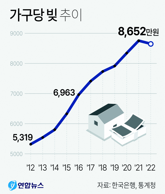 연말 기준 가구당 부채가 감소한 것은 지난 2002년 3076만 원에서 2003년 3059만 원으로 0.56% 줄어든 이후 처음이다. 이후 2003년부터 2021년까지는 단 한 해도 빠짐없이 가구당 부채가 증가세를 나타냈다.