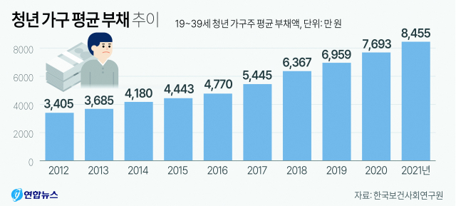 27일 한국보건사회연구원의 ‘청년 미래의 삶을 위한 자산 실태 및 대응방안’ 보고서에 따르면, 19~39세 청년이 가구주인 가구의 평균 부채는 2021년 8455만 원이었다. 2012년(3405만 원)에 비하면 약 2.5배에 달하는 수준이다. 평균값은 부채가 없는 청년을 포함해 계산했다. 부채가 있는 청년만 대상으로 평균값을 낼 경우 2021년 평균 부채액은 1억 1511만 원에 달했다.