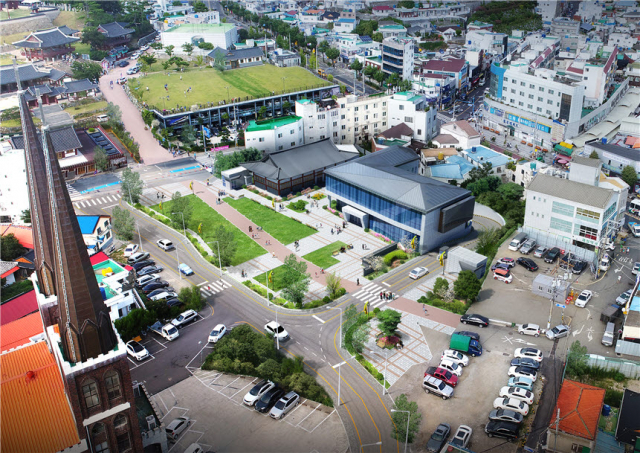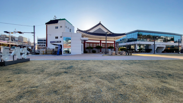 핵심 시설인 청남루를 빼고 조성된 통제영거리. 가운데 기와지붕을 얹은 건물이 남문 디지털 전시관이 들어설 병영체험관, 오른쪽 현대식 건물이 역사홍보관이다. 지금은 별다른 콘텐츠가 없어 텅빈 상태로 방치되고 있다. 김민진 기자
